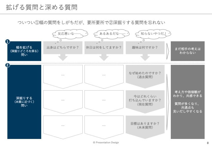 質問については、話題を広げる質問と、話題を深掘りする質問をうまく組み合わせて行いましょう。